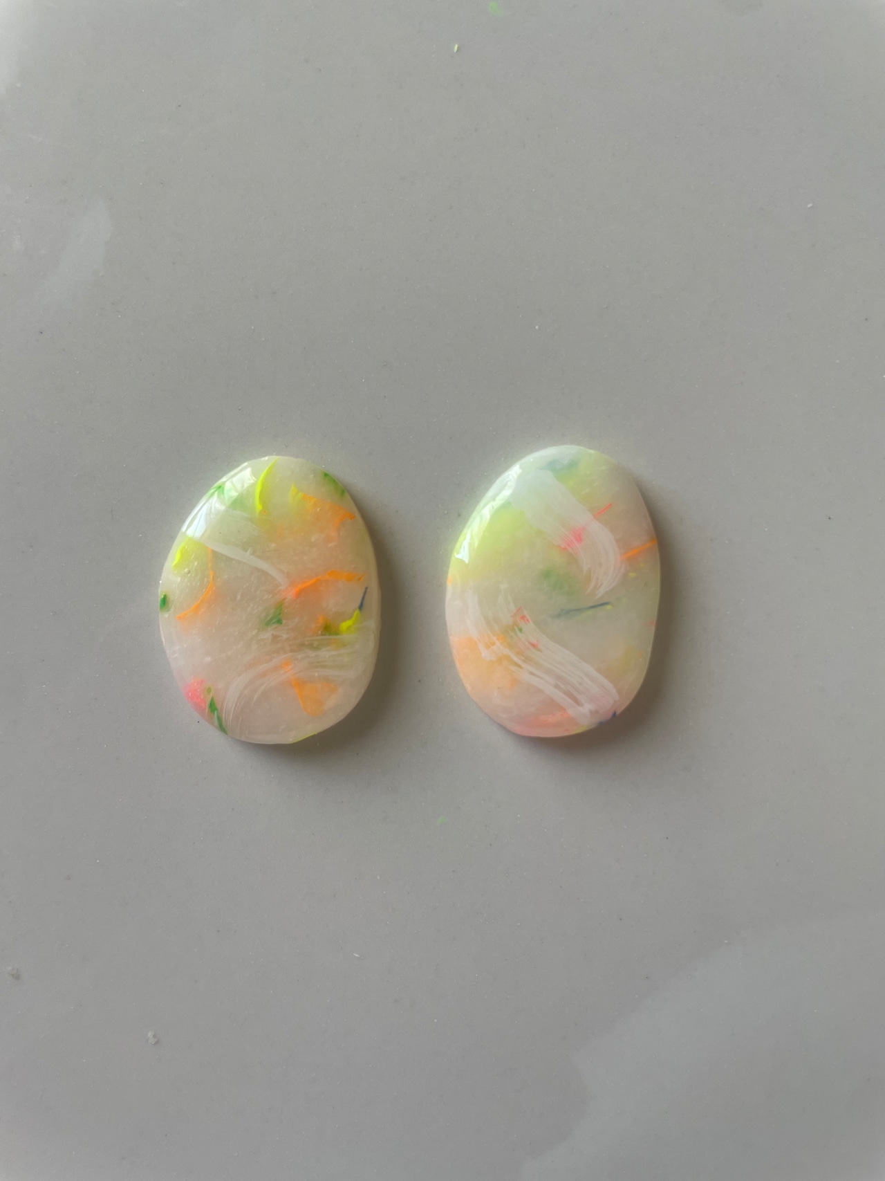 半透明のポリマークレイにアクリル絵の具で色付けして絶妙な混ぜ具合で形取って焼いています。色の出方が毎回違う1点物です。上に白でペイントして馴染みやすくしレジンをかけてツヤツヤに仕上げました。着画は同じシリーズの物です☺️